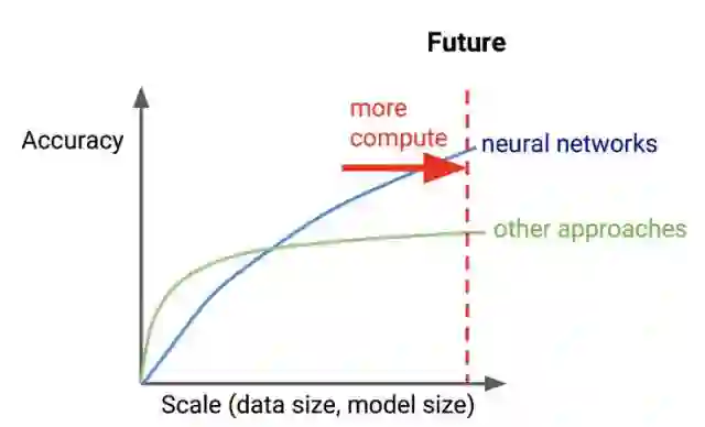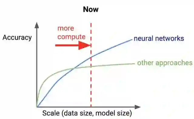 如今,神经网络与其他方法随数据、模型大小变化的准确率对比图如下: