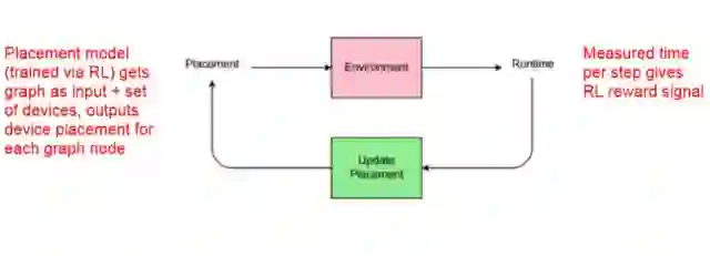 通过强化学习训练的 Placement 模型将图(graph)作为输入,并且将一组设备、输出设备作为图中的节点。在 Runtime 中,给定强化学习的奖励信号而度量每一步的时间,然后再更新 Placement。