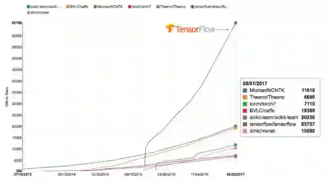 下面是 TensorFlow 项目近年来在 Github 上的关注度,我们可以看到 TensorFlow 是所有同类深度学习框架中关注度最大的项目。