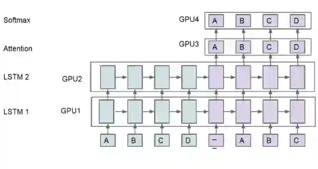 对于大型模型来说,模型并行化处理是极其重要的,因为单个模型的训练时间太长以至于我们很难对这些模型进行反复的修改。因此,在多个计算设备中处理模型并取得优秀的性能就十分重要了。如下所示,我们可以将模型分割为四部分,运行在四个 GPU 上。