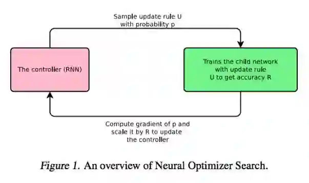 而 Google Brain 在 ICML 2017 的论文《Neural Optimizer Search with Reinforcement Learning》中,就讲到了一种学习优化更新规则的技术。神经优化器搜索如下图所示:
