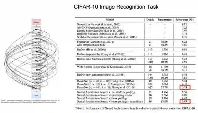 在 CIFAR-10 图像识别任务上,神经架构搜索的表现与其他顶级成果的表现对比如上图所示。