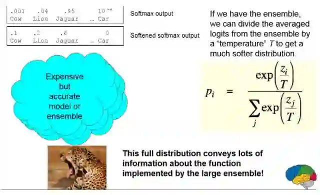 Geoffrey Hinton 和 Jeff Dean 等人曾发表过论文 Distilling the Knowledge in a Neural Network。在该篇论文中,他们详细探讨了将知识压缩到一个集成的单一模型中,因此能使用不同的压缩方法将复杂模型部署到低计算能力的设备中。他们表示这种方法显著地提升了商业声学模型部署的性能。
