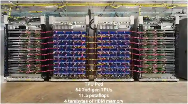 下图是 TPU 组成的大型配置:由 64 块 TPU 二代组成,每秒 11.5 千万亿次浮点运算,4 太字节的 HBM 存储。