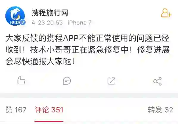 对此,携程方面回应称,大家反馈的携程APP不能正常使用的问题已经收到!技术小哥哥正在紧急修复中!修复进展会尽快通报大家哒!