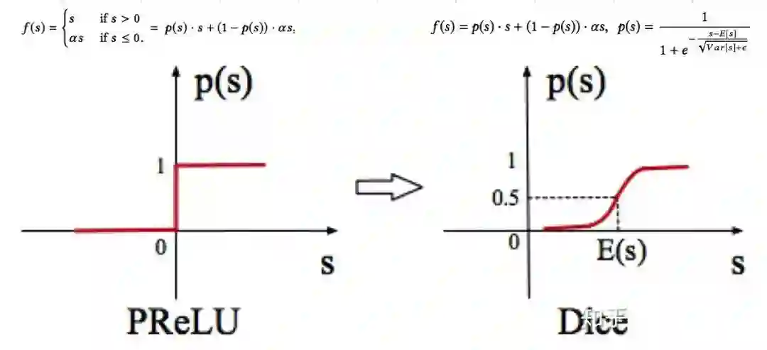 Dice 可以看作是一种广义的 PReLu,当 E(s) = 0 且 Var(s) = 0 时,Dice 退化为 PReLU。