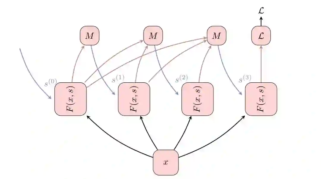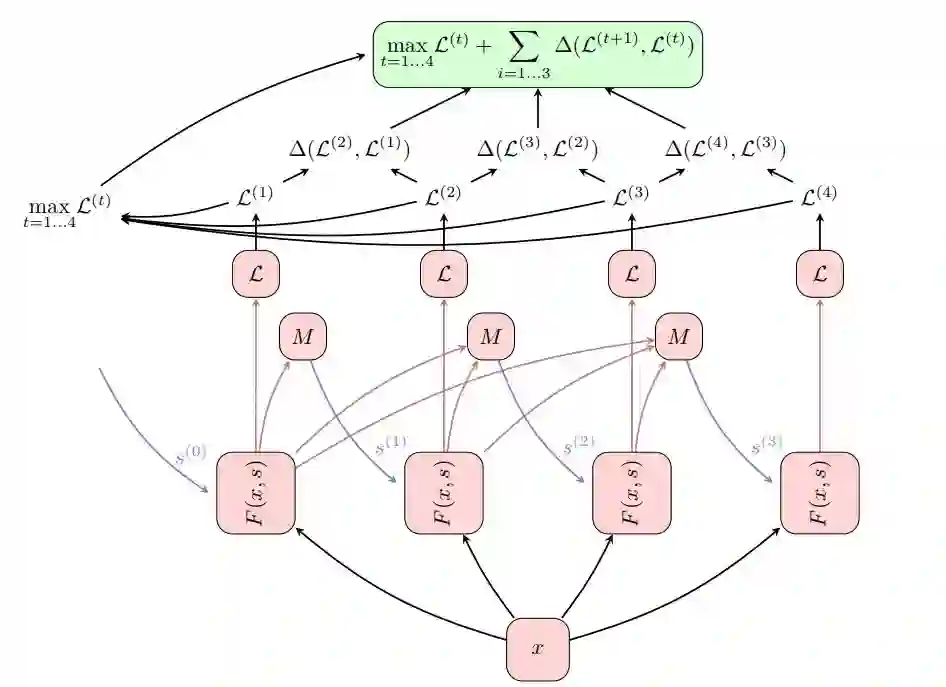 图1:运行4个时间步长的ThinkNet示意图(在状态依赖函数F(x, s)上实现)。在t=0时,网络以状态s(0)进行初始化。在 t > 0时,混合函数M根据之前的时间步长t、t-1、……、1生成的所有输出来计算下一个状态s(t+1)。最终,在流程的最后计算损失L。