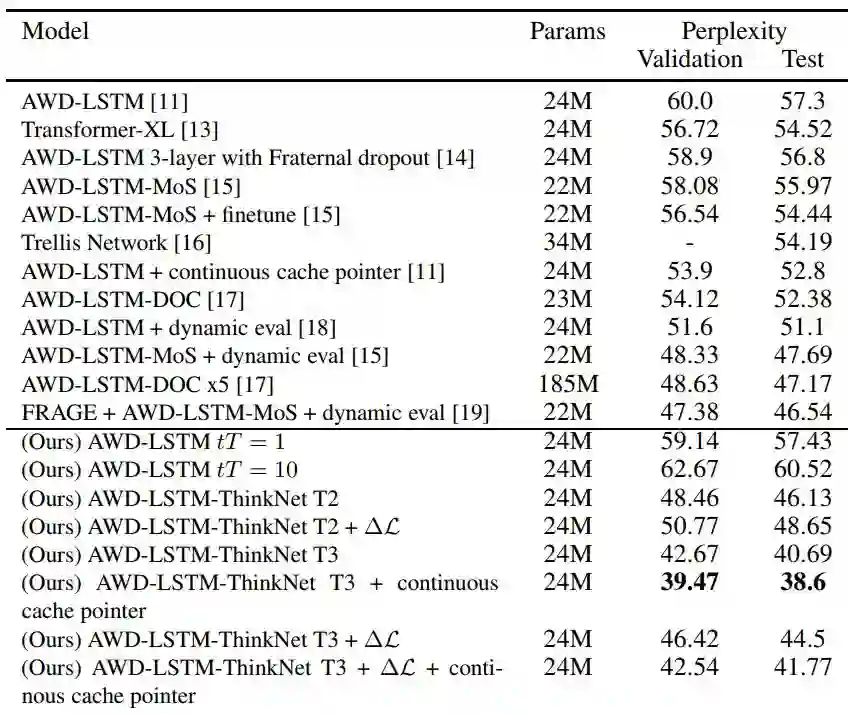 表1:上面是PTB语言建模的先前最佳技术,下面是我们的模型。所有ThinkNet模型都使用tT = 10(测试ThinkNet时间步长)。在没有使用原始AWDLSTM模型任何附加参数的情况下,以3个时间步长训练的两个ThinkNet模型都大大超过了先前的技术水平。