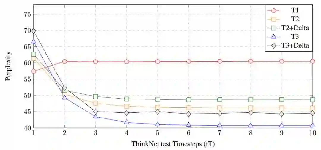 图3:在PTB上,以1到3 个ThinkNet 时间步长训练的模型在1到10个测试时间步长 (tT)下进行评估。然而普通的AWD-LSTM 模型 (T1) 的性能在超过训练使用的时间步长时会下降,但ThinkNet模型会继续改进直到收敛。