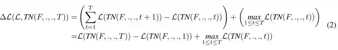 等式 2中的“差异和”项有一个有趣的属性,它是可伸缩的,除了第一项和最后一项,其它项都可相互抵消,结果变成L(TN(F, ., ., T )) − L(TN(F, ., ., 1))。这使得整个方程简单多了,虽然效率不高——因为仍然需要迭代所有损失来计算最大损失项。