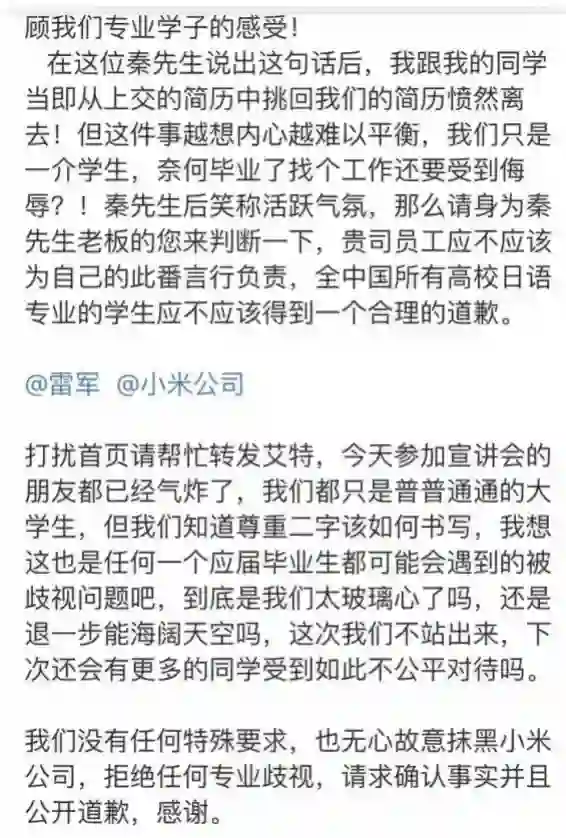 NO.5 小米HR郑州大学校招涉嫌专业歧视