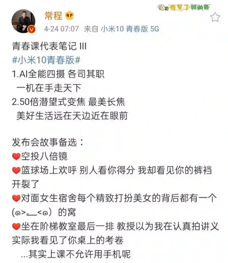 小米10青春版是小米首次用上支持50X变焦的潜望式相机的手机,能够理解小米高管对这款产品赋予了极高的期望,有一说一,潜望镜的功能很强大,的确能够拍到很远的东西,但是你确定一个500强企业的公司高管要用这种方式进行宣传吗?
