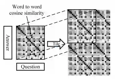 下图是文章算法的核心,QA相似性矩阵。垂直方向代表问题,水平方向代表回答。矩阵中的每个元素代表问题中的某个词的词向量与回答中的某个词的词向量的Cosine相似度。