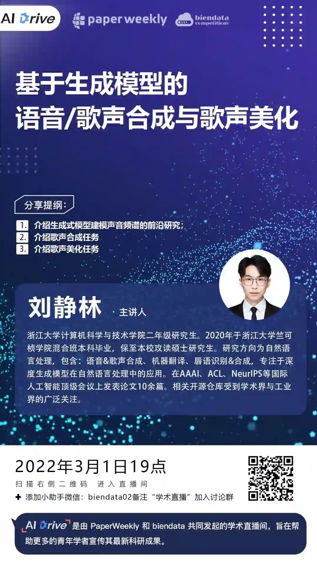 本期 AI Drive,我们邀请到浙江大学计算机科学与技术学院硕士生刘静林,为大家在线解读其发表在 AAAI 2022 的最新研究成果:DiffSinger: Singing Voice Synthesis via Shallow Diffusion Mechanism。对本期主题感兴趣的小伙伴,3 月 1 日(本周二)晚 7 点,我们准时相约 PaperWeekly 直播间。