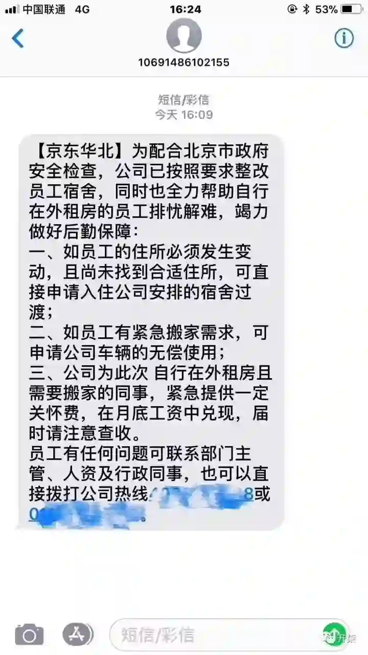我想赞扬一下京东,因为我看到了这条短信,对于在专项行动中受影响员工表示关怀的短信,这是我所知道的第一条这类短信,它让这个严冬有了一丝暖意: