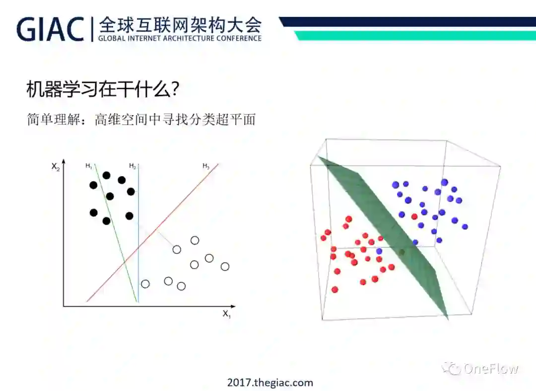 注:机器学习可以视为一种从训练数据中自动推导出程序的方法。以最常见的有监督学习(supervised learning)为例,可简单理解为,通过优化方法自动在高维空间找到分类超平面。