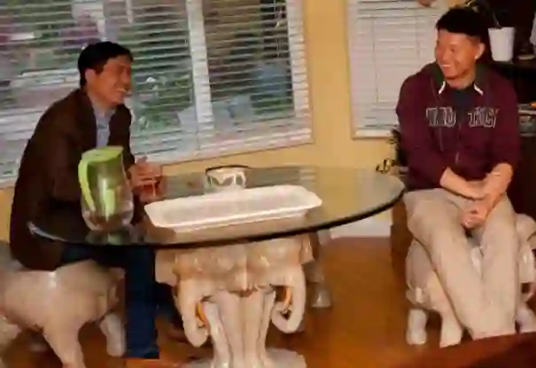 2016年,朱松纯(左)与吴田富(右)在家中交谈