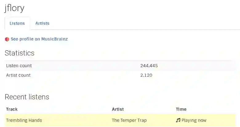 最后,通过在 Fedora 上用你的音乐客户端播放一首歌来测试它。你播放的歌曲会出现在 ListenBrainz 个人资料页中。