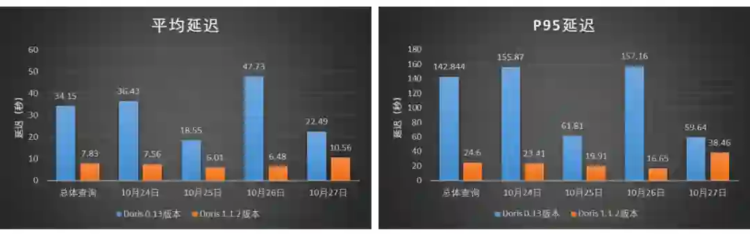 为了验证调优后的 Doris 1.1.2 版本在小米 A/B 实验场景之外的性能表现,我们选取了小米用户行为分析场景进行了 Doris 1.1.2 版本和 Doris 0.13 版本的并发查询性能测试。我们选取了 2022年10月24日、25日、26日和 27日这 4 天的小米线上真实的行为分析查询 Case 进行对比查询,测试结果如图所示,Doris 1.1.2 版本相比 Doris 0.13 版本,总体的平均延迟降低了大约7 7%,P95 延迟降低了大约 83%。在该测试中,Doris 1.1.2 版本相比 Doris 0.13 版本的查询性能有 4~6 倍的提升。