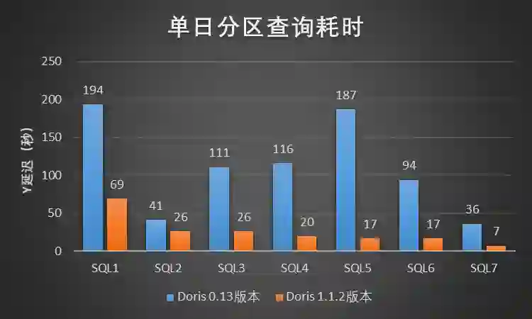 我们选择了 A/B实验场景下的 7 份 A/B 实验报告对两个版本进行测试,每份 A/B 实验报告对应小米 A/B实验平台页面的两个模块,每个模块对应数百或数千条查询 SQL。每一份实验报告都以相同的并发向两个版本所在的集群提交查询任务。测试结果如图所示,Doris 1.1.2 版本相比 Doris 0.13 版本,总体的平均延迟降低了大约 52%。在该测试中,Doris 1.1.2 版本相比 Doris 0.13 版本的查询性能提升了超过 1 倍。