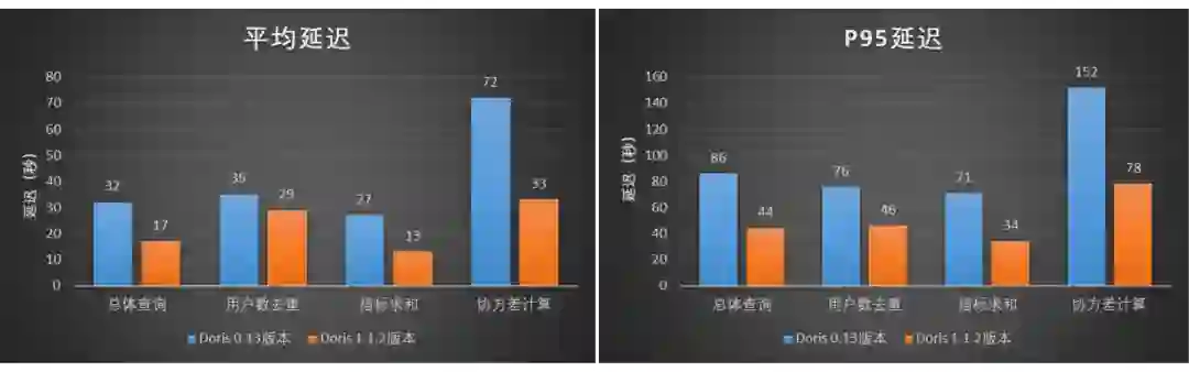 我们选择了 A/B 实验场景中一批典型的用户去重、指标求和以及协方差计算的查询 Case(SQL 总数量为 3245)对两个版本进行并发查询测试,测试表的单日分区数据大约为 31 亿(数据量大约 2 TB),查询的数据范围会覆盖最近一周的分区。测试结果如图所示,Doris 1.1.2 版本相比 Doris0.13版本,总体的平均延迟降低了大约 48%,P95 延迟降低了大约 49%。在该测试中,Doris 1.1.2 版本相比 Doris0.13 版本的查询性能提升了接近 1 倍。