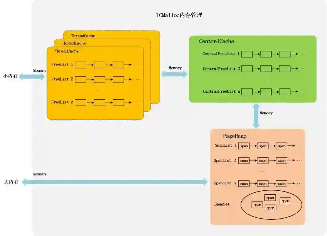 TCMalloc 使用了 ThreadCache、CentralCache 和 PageHeap 三层缓存来管理小内存的分配和释放。