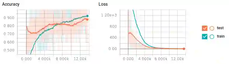 你可能会看到这里出了一个很大的问题。对于训练数据,分类器达到了100%的准确度和0%的误差损失,但是测试数据的准确度最多只能达到80%而且还有很大的损失。这就是一个明显的过拟合——一些典型的原因包括没有足够的训练数据或神经元数量太多。