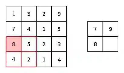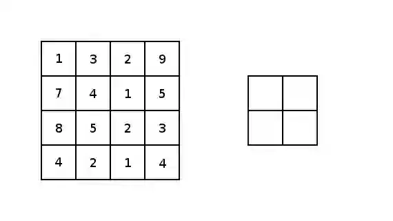 实质上,大多数卷积神经网络都包含卷积和池化。最常见的是,一个用于卷积的3×3内核滤波器。特别是,以2×2的步幅和2×2内核的较大值池化是基于内核中的较大像素值来缩小图像的一种激进方式。下图展示的是一个内核为2X2和两维上步幅都为2的简单例子。