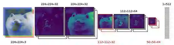 我们分解一下这个模型。它从一张224x224x3的图像开始,在三个通道上通过卷积得到32个特征图。我们将这组32个特征图一起卷积得到另外32个特征。 然后将其池化得到112x112x32的图像,随后两次卷积得到64个特征,最后池化到56x56x64。然后将这个最终池化的层的每个单元全连接到512个神经元上,并基于类别的数量最后连接到softmax层。