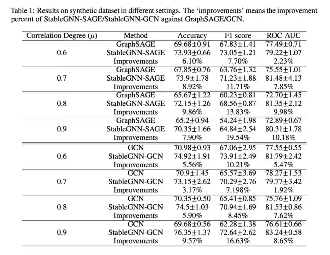 我们通过控制“房子”模体和“星星”模体的相关性程度,生成了 {0.6,0.7,0.8,0.9} 四种偏差程度不同的训练数据,更多生成数据的细节请参考原文。我们分别以 GCN/GraphSAGE 作为基模型实现了我们的模型,所以本节主要和相应的基模型进行了对比。