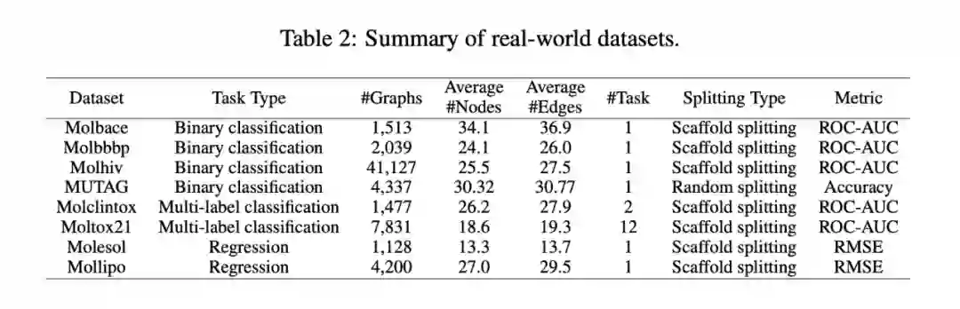 我们在 OGB 的七个分子图性质预测的数据上展开实验,与常用的数据不同的是,这些数据都采用 scaffold splitting 从而使得具有不同结构的图数据划分到训练集和测试集。此外,我们还采用了常用的 MUTAG 数据集用于解释我们的结果。
