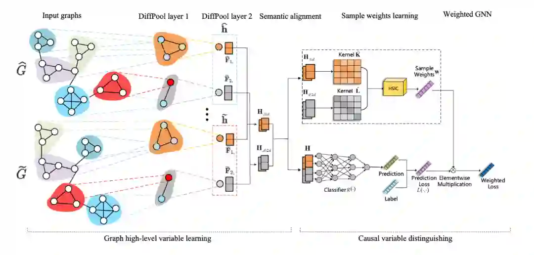 所提出框架的基本想法是设计一个因果表示学习方法来抽取有意义的图高层语义变量然后估计他们对于图级别任务的真实因果效应。如图 2 所示,所提出的模型框架主要分为两个部分:图高层语义表示学习模块和因果变量区分模块。