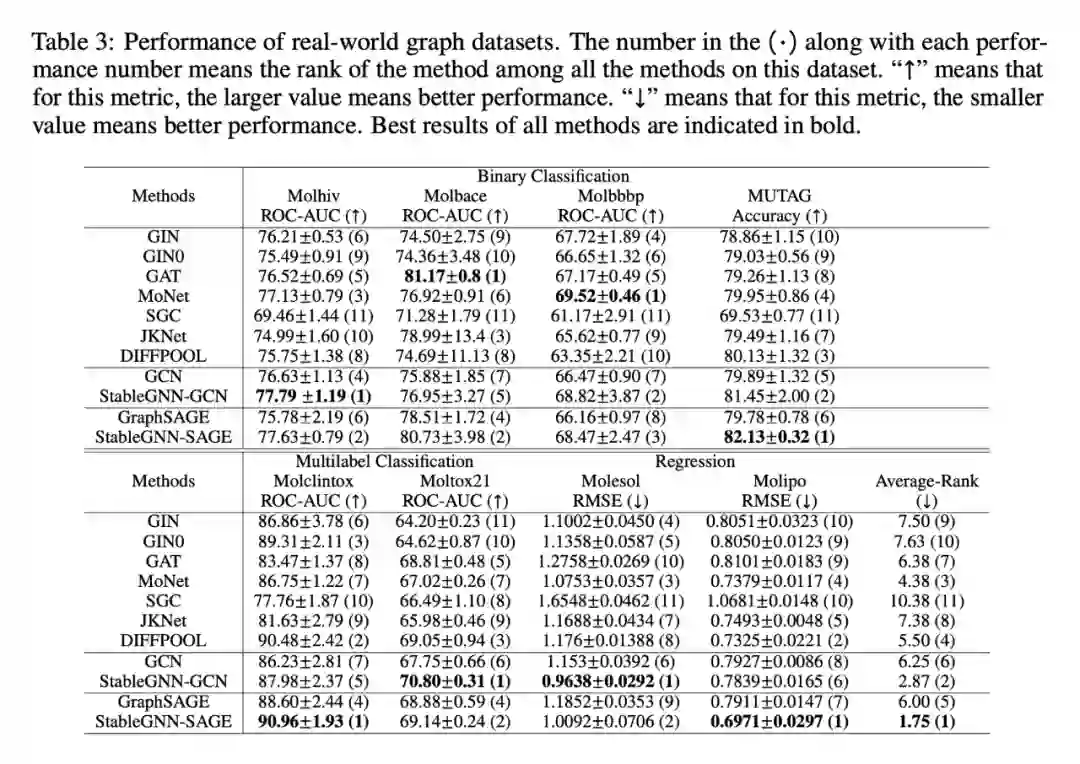 表 2 是数据集的统计信息。表 3 是实验结果。从表中可以看出,我们的方法综合性能排在前两位,远远大于排名第 3 的方法,证明了现有 GNN 方法在 OOD 场景下的图预测任务上表现的都不好而我们的方法可以取得较好的结果。同时在不同类型数据,不同的任务的数据集上我们都取得了较好的效果,证明了我们的方法是一个通用的框架。