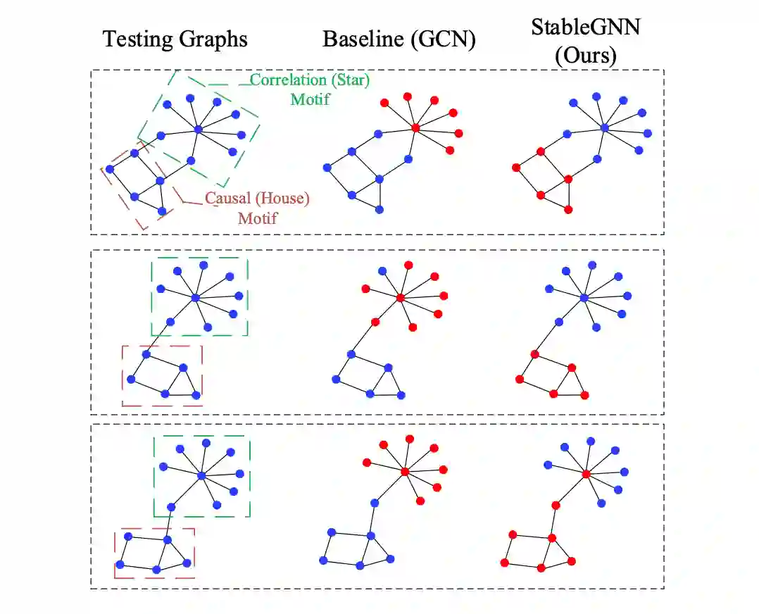 如图 1 所示,以“房子”模体分类任务为例,其中图的标签表示一个图中是否有“房子”模体。GCN 模型是在“房子”模体和“星星”模体高度相关的训练图上训练的。在这个数据上,“房子”模体和“星星”模体将会高度相关。这个意料之外的相关性将会导致“星星”模体的结构特征和“房子”标签的虚假相关。 图 1 的第二列展示了用于 GCN 预测的最重要的子图可视化结果 (由 GNNExplainer 产生)。由结果可知,GNN 倾向于利用星星模体做预测。然而当遭遇没有“星星”模体的图,或者其他模体( 比如,“ 钻石“ 模体) 和星星模体在一起时, GCN 模型被证明容易产生错误的结果。