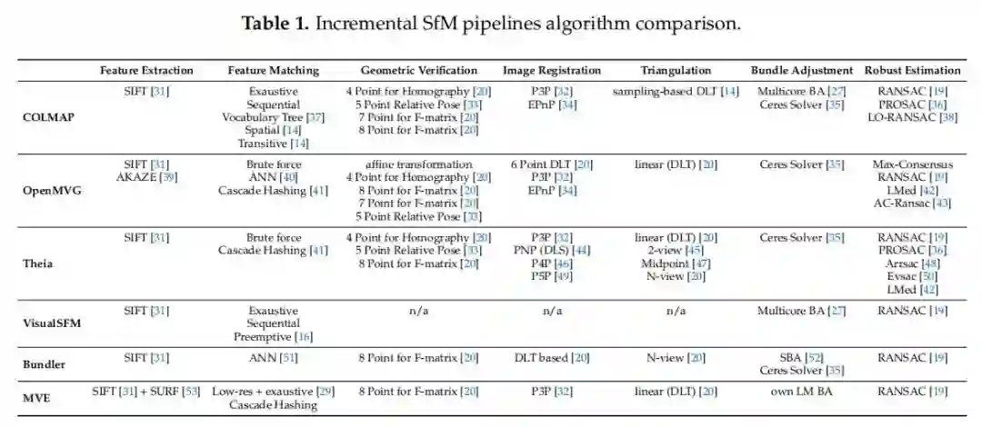 实现增量式SfM框架的包含COLMAP、openMVG、Theia等,如图 6所示典型增量式SfM框架在增量式SfM算法各个阶段的细节对比。