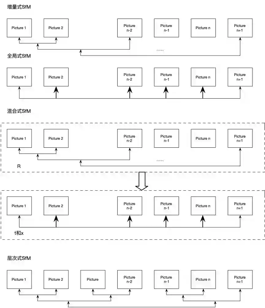 层次式SfM同样借鉴incremental SfM和global SfM各自优势,但是基于分段式的incremental SfM和全局式SfM,没有像混合式SfM分成两个阶段进行。