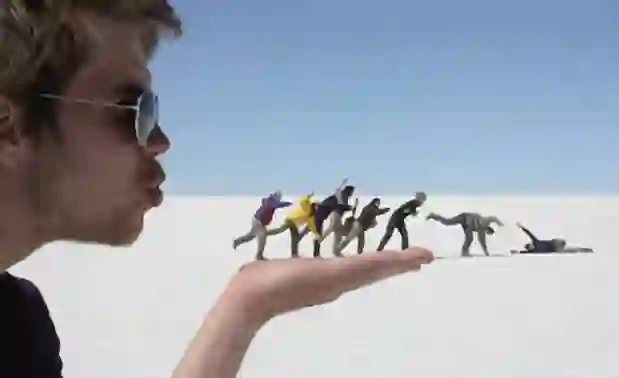 但是众所周知,F 是非常复杂的函数,因为从单张图像中获取具体的深度相当于从二维图像推测出三维空间,即使人类的双眼也无法获取深度信息,如图 9所示,人类无法判断所谓的巨人手掌上是模型还是摆拍(如果前方巨人换成孙大圣到是有可能,不过已经变成玄幻电影)。所以传统的深度估计在单目深度估计上效果并不好。人们更着重于研究多视觉几何,即从多张图片中得到深度信息。因为两张图片就可以根据视角的变化得到图片之间disparity的变化,从而达到求取深度的目的。