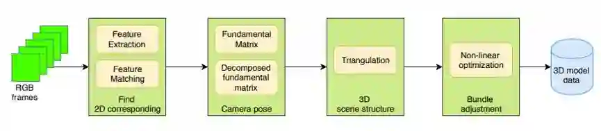 Structure from Motion(SfM)是一个估计相机参数及三维点位置的问题。一个基本的SfM pipeline可以描述为:对每张2维图片检测特征点(feature point),对每对图片中的特征点进行匹配,只保留满足几何约束的匹配,最后执行一个迭代式的、鲁棒的SfM方法来恢复摄像机的内参(intrinsic parameter)和外参(extrinsic parameter)。并由三角化得到三维点坐标,然后使用Bundle Adjustment进行优化。