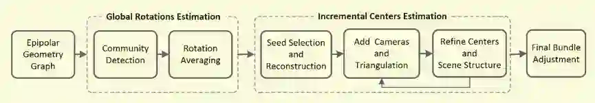 用全局的方式提出一种基于社区的旋转误差平均法,该方法既考虑了对极几何的精度又考虑了成对几何的精度。基于已经估计的相机的绝对旋转姿态,用一种增量的方式估计相机光心位置。对每个添加的相机,其旋转和内参保持不变,同时使用改进的BA细化光心和场景结构。
