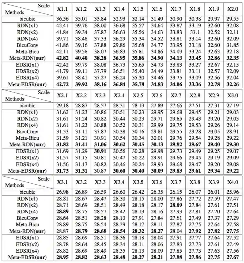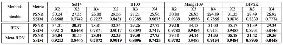 表 3:当缩放因子为X2, X3, X4,Meta-RDN与RDN的对比结果