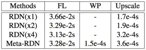 在表2中,FL表示Feature Learning模块,WP表示Meta-SR的Weight Prediction模块,Upscale是Upscale模块。测试是跑在B100上,测试的缩放因子是2。