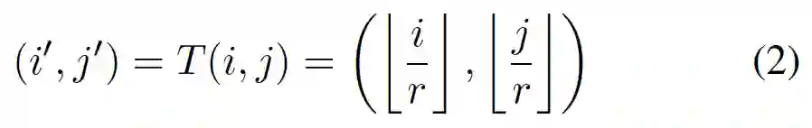Location Projection。对于SR图像上的每个像素(i, j),Location Projection的作用是找到与像素(i, j)对应的LR图像上的像素(i′, j′)。本文认为,像素(i, j)的值是由像素(i′, j′)的特征所决定。下面的投影算子可映射这两个像素: