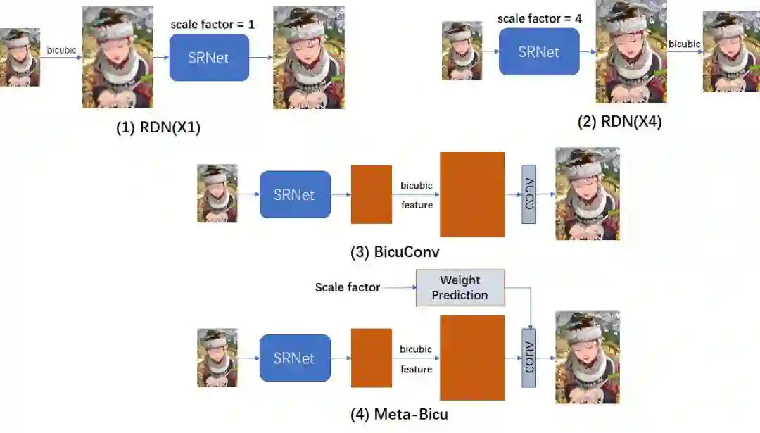 由于先前不存在类似于Meta-SR的方法,本文需要设计若干个baselines(见图3),以作对比证明Meta-SR的优越性。