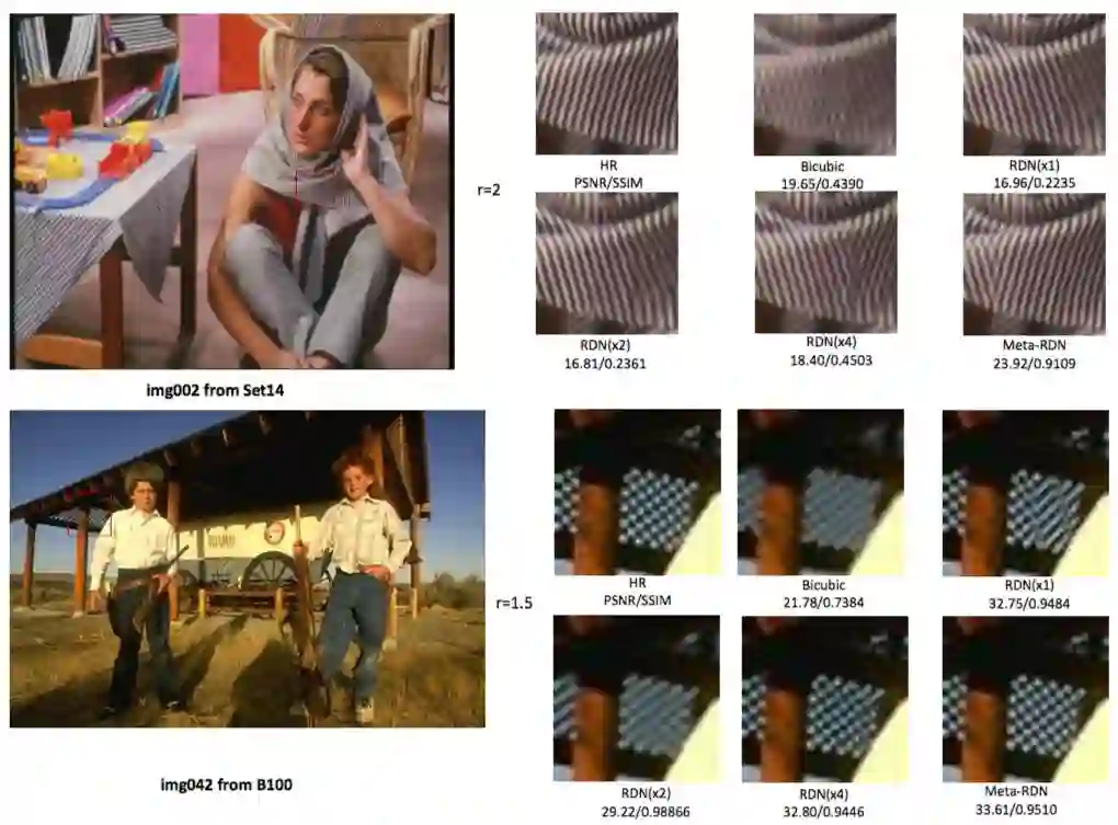 对于RDN(x4)和EDSR(x4),当缩放因子接近1时,Meta-RDN与RDN(x4)(或者Meta-EDSR与EDSR(x4)之间) 存在着巨大的性能差距。此外,当r>k时,EDSR(x4)和RDN(x4)不得不在将其输入网络之前放大LR图像。