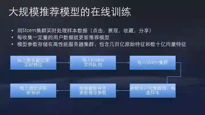 目前,头条的推荐算法模型在世界范围内也是比较大的,包含几百亿原始特征和数十亿向量特征。整体的训练过程是线上服务器记录实时特征,导入到Kafka文件队列中,然后进一步导入Storm集群消费Kafka数据,客户端回传推荐的label构造训练样本,随后根据最新样本进行在线训练更新模型参数,最终线上模型得到更新。这个过程中主要的延迟在用户的动作反馈延时,因为文章推荐后用户不一定马上看,不考虑这部分时间,整个系统是几乎实时的。