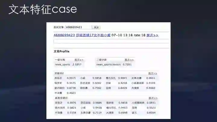 上图是今日头条的一个实际文本case。可以看到,这篇文章有分类、关键词、topic、实体词等文本特征。当然不是没有文本特征,推荐系统就不能工作,推荐系统最早期应用在Amazon,甚至沃尔玛时代就有,包括Netfilx做视频推荐也没有文本特征直接协同过滤推荐。但对资讯类产品而言,大部分是消费当天内容,没有文本特征新内容冷启动非常困难,协同类特征无法解决文章冷启动问题。