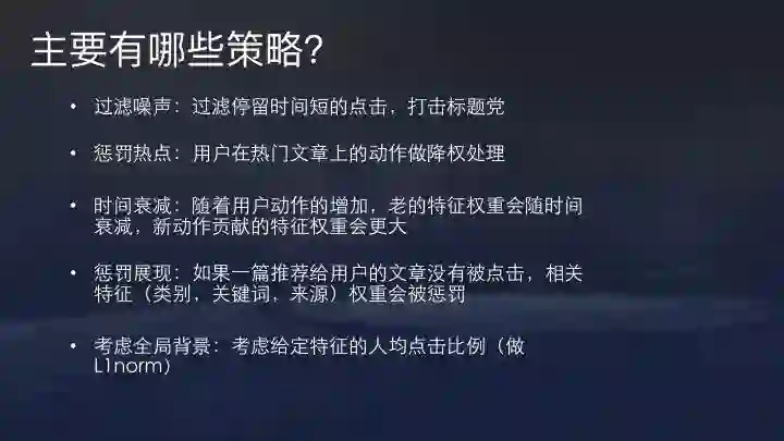 当然最简单的用户标签是浏览过的内容标签。但这里涉及到一些数据处理策略。主要包括:一、过滤噪声。通过停留时间短的点击,过滤标题党。二、热点惩罚。对用户在一些热门文章(如前段时间PG One的新闻)上的动作做降权处理。理论上,传播范围较大的内容,置信度会下降。三、时间衰减。用户兴趣会发生偏移,因此策略更偏向新的用户行为。因此,随着用户动作的增加,老的特征权重会随时间衰减,新动作贡献的特征权重会更大。四、惩罚展现。如果一篇推荐给用户的文章没有被点击,相关特征(类别,关键词,来源)权重会被惩罚。当然同时,也要考虑全局背景,是不是相关内容推送比较多,以及相关的关闭和dislike信号等。