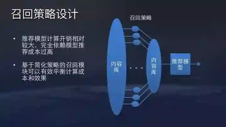 但因为头条目前的内容量非常大,加上小视频内容有千万级别,推荐系统不可能所有内容全部由模型预估。所以需要设计一些召回策略,每次推荐时从海量内容中筛选出千级别的内容库。召回策略最重要的要求是性能要极致,一般超时不能超过50毫秒。