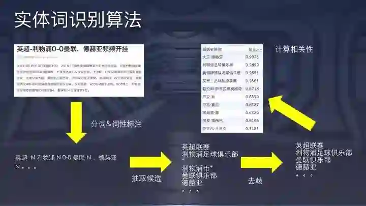 上图是一个实体词识别算法的case。基于分词结果和词性标注选取候选,期间可能需要根据知识库做一些拼接,有些实体是几个词的组合,要确定哪几个词结合在一起能映射实体的描述。如果结果映射多个实体还要通过词向量、topic分布甚至词频本身等去歧,最后计算一个相关性模型。