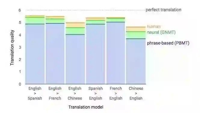 关键成果:与人类翻译的准确率之差缩小了55%-85% (研究者使用6分制打分标准评估得到)。如果不依赖谷歌庞大的数据库进行训练,这一结果很难复现。